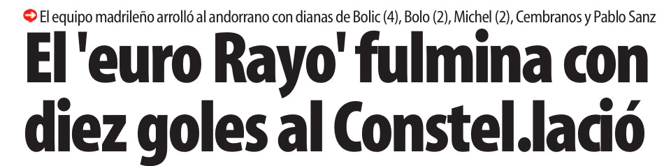 El partido, evidentemente, no pudo verse por televisión y había que hacer juegos malabares para enterarse del resultado por la radio. Por eso, cuando escuché que el partido había acabado 0-10 y el Rayo se había pegado un homenaje a costa de un Constel·lació que renunció al balón, se atrincheró atrás y terminó convirtiéndose en el equipo que sacaba más veces del centro del campo en un partido europeo en su propio estadio, fui feliz. Para algunos, pasar una previa de UEFA es tan grande como alzar una Champions. Y para mí, en ese instante, lo fue todo.
